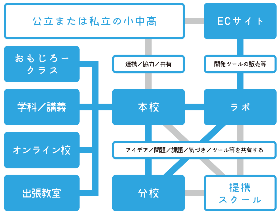 当校の理念に共感していただいた方々に運営していただく姉妹校または協力校。 本校やラボで考案されたアイデアをベースに、姉妹校または協力校それぞれの地域性や特色を活かしたスタイルで運営されます。 |